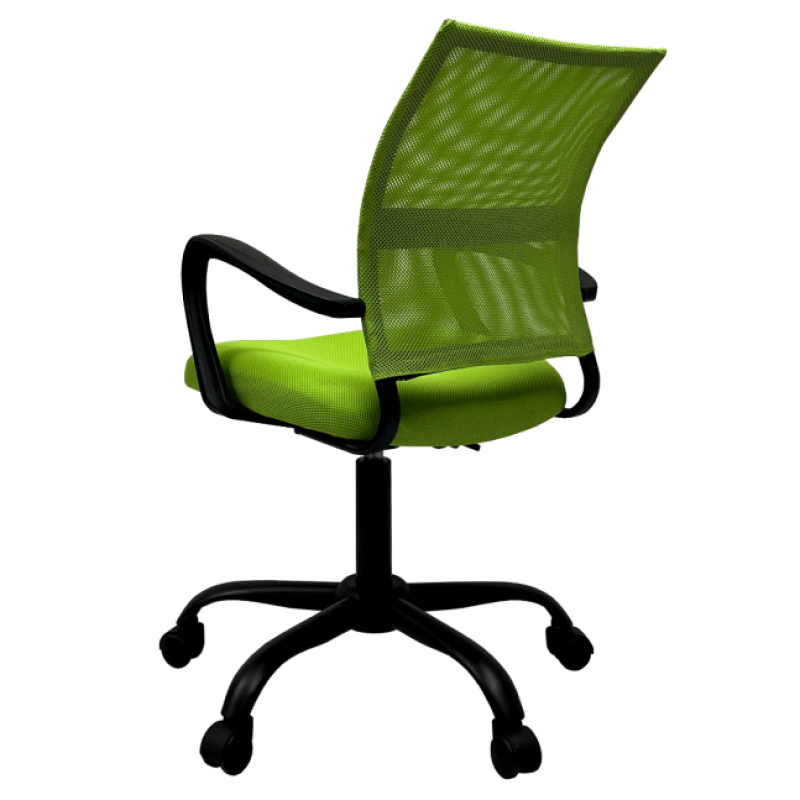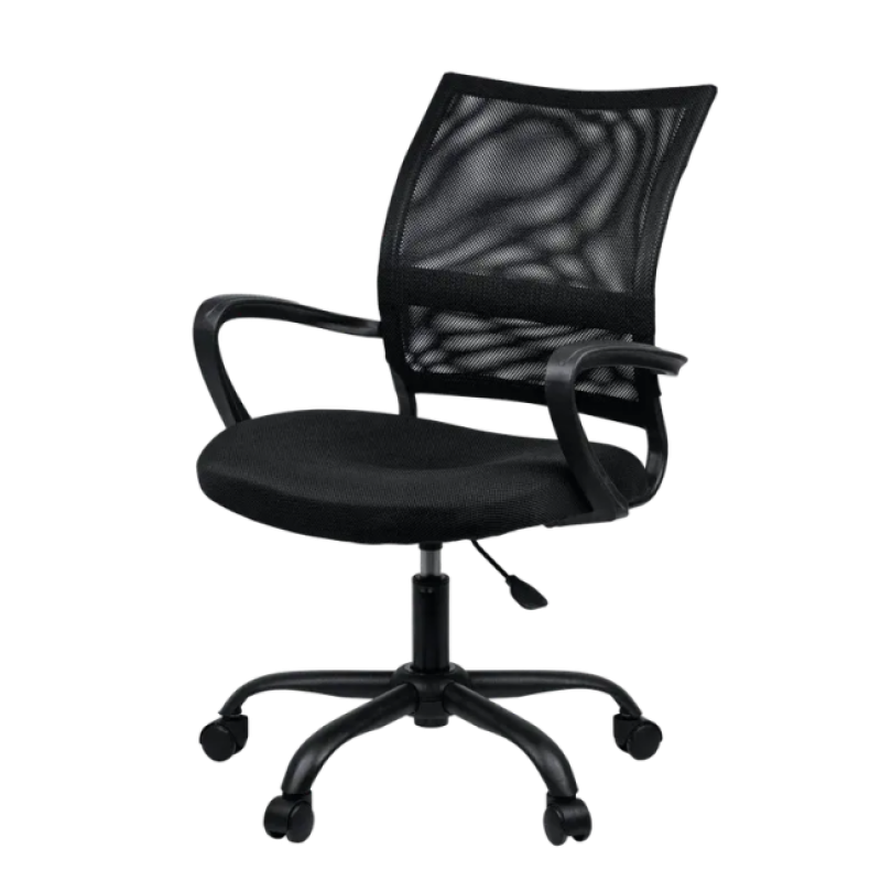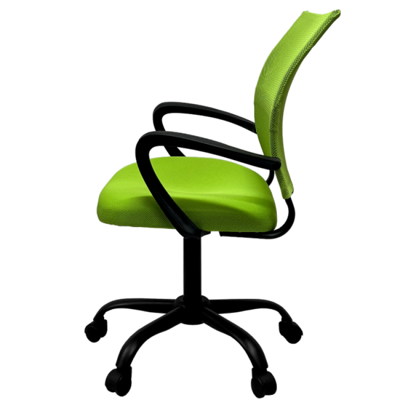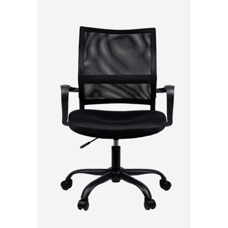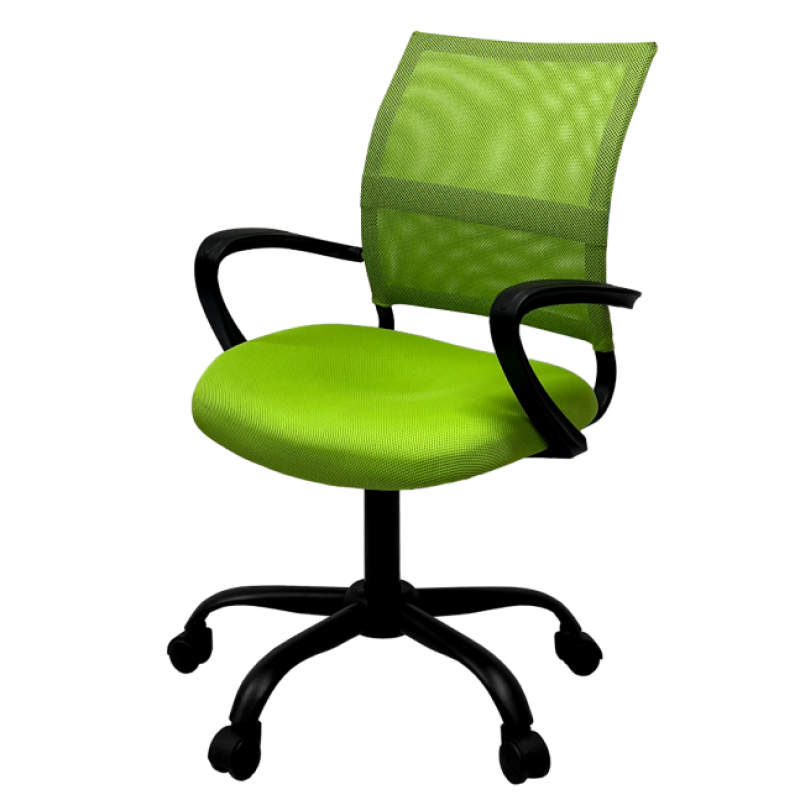 Металлическим пятилучием с роликами, пластиковыми подлокотниками.