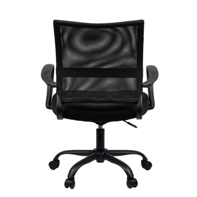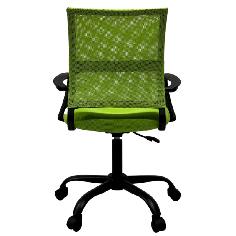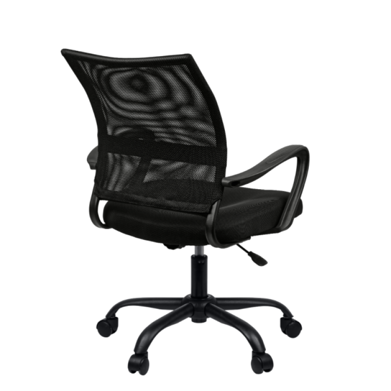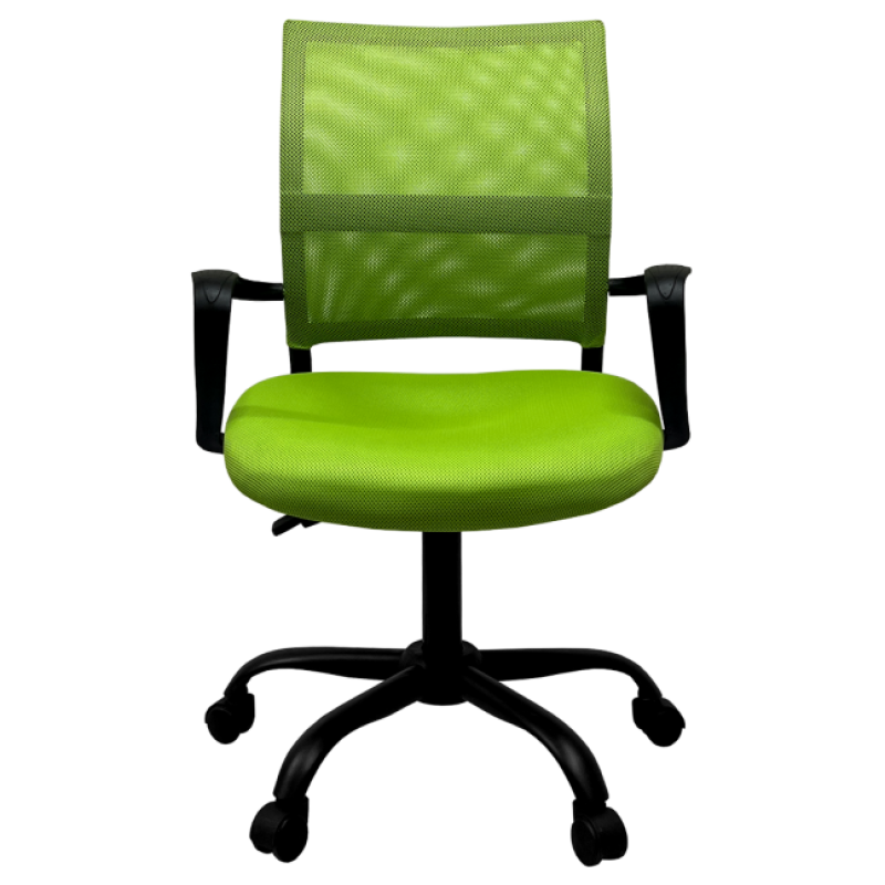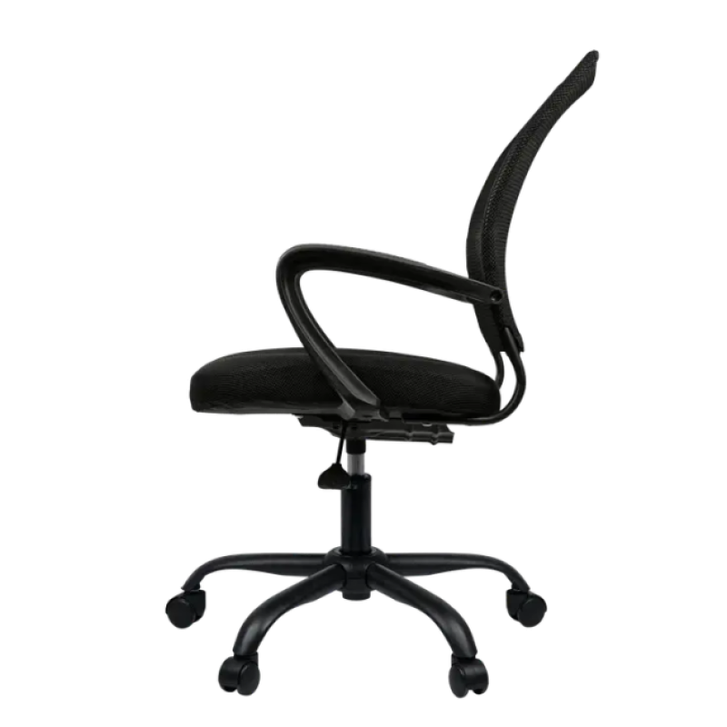 Металлическим пятилучием с роликами, пластиковыми подлокотниками.