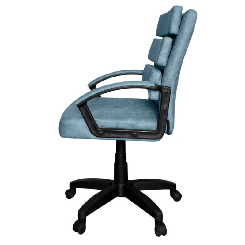 Пластиковым пятилучием с роликами, пластиковыми подлокотниками с мягкими накладками.