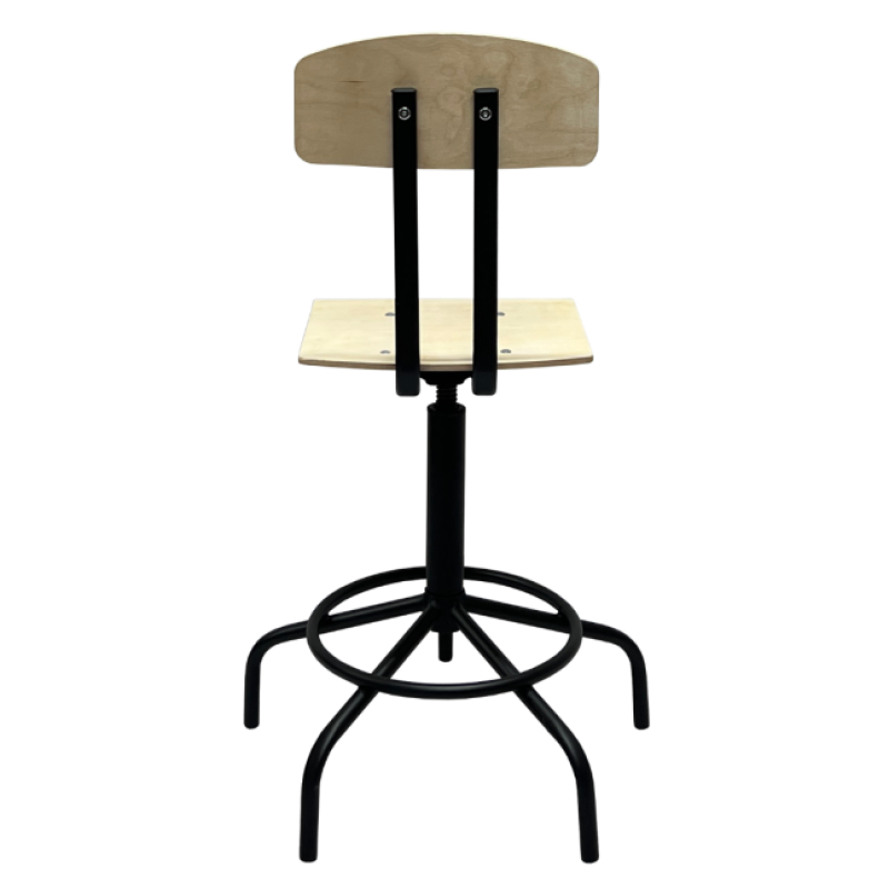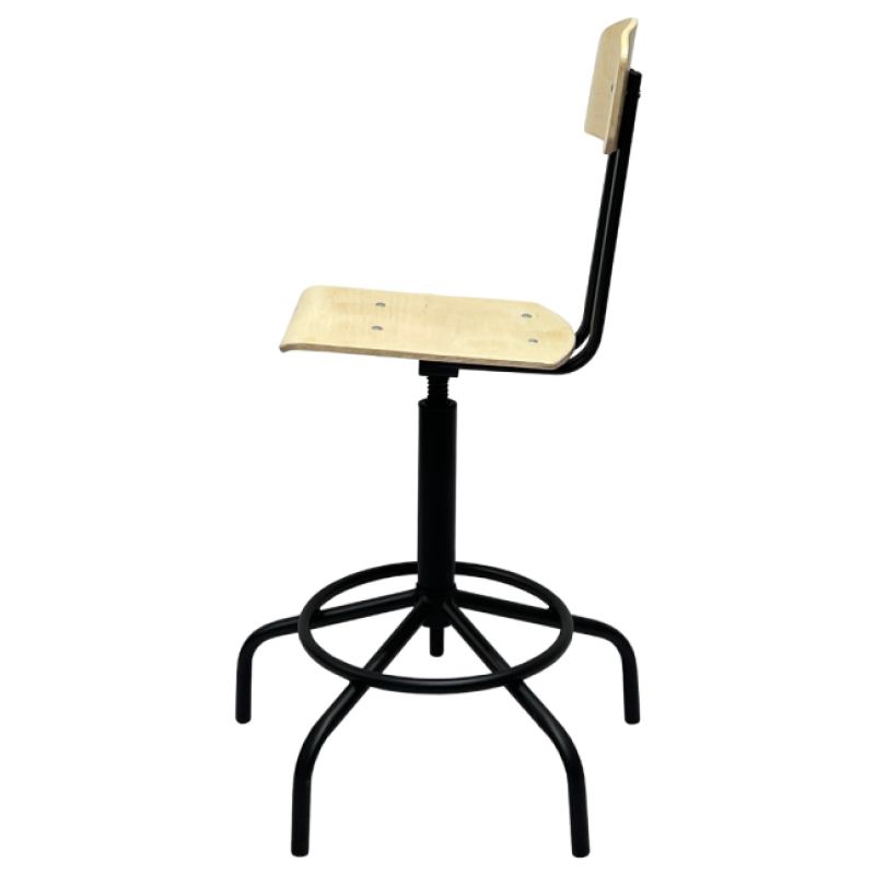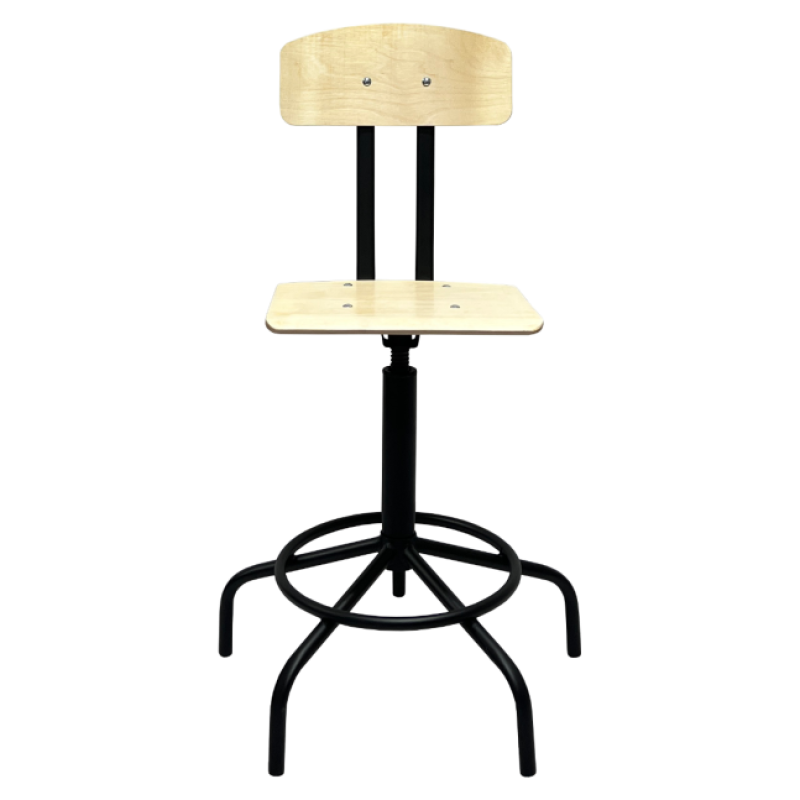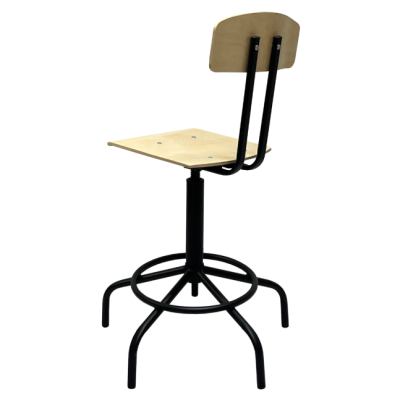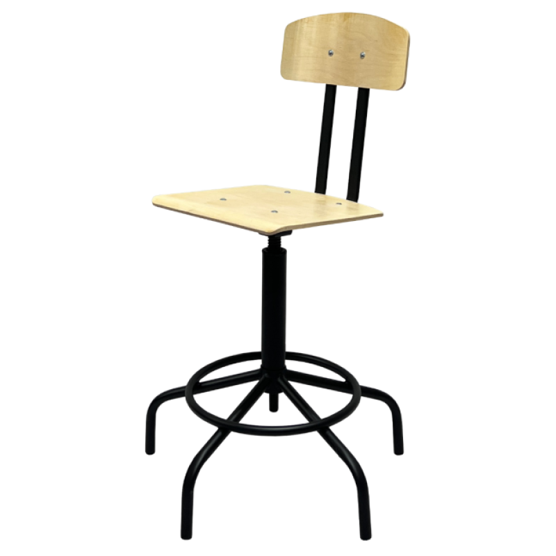 Стул со спинкой и сидением из лакированной фанеры на металлическом каркасе с неподвижной ринг-базой. Регулировка сиденья осуществляется с помощью надёжного винтового механизма.